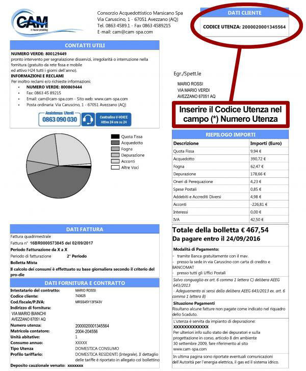 Si prega di non utilizzare il numero di utenza (che si trova in alto a destra della fattura)ma il codice cliente riportato nella prima pagina della fattura.